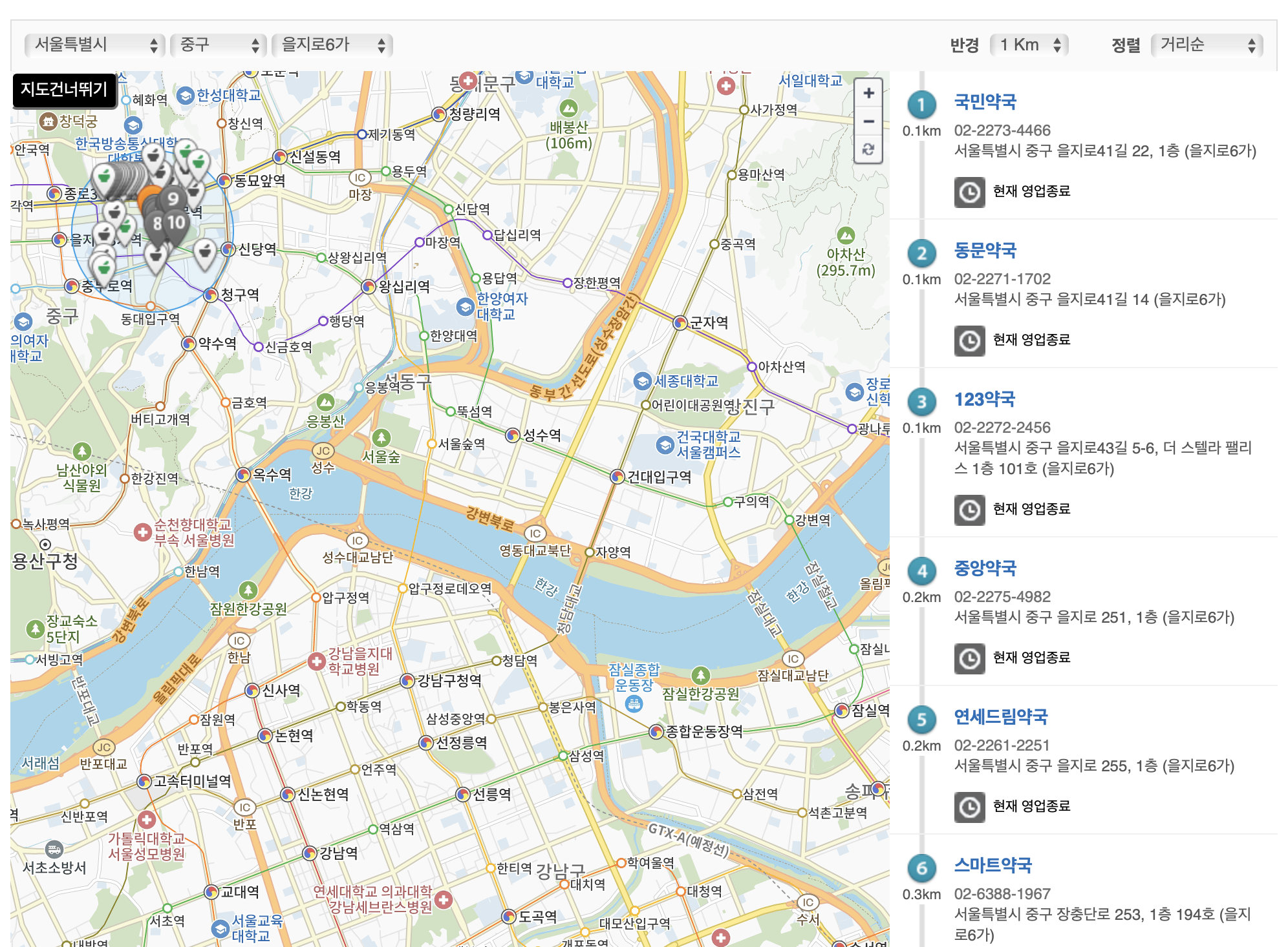 - 병원명, 구·군, 동까지 검색 가능하므로 내 위치 기준으로 가까운 병원을 찾아 볼 수 있습니다.