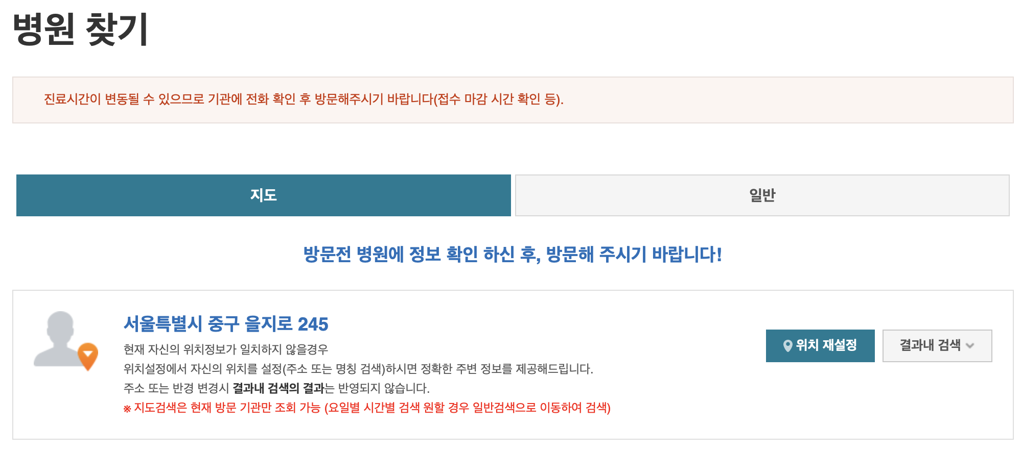 - 진료 과목이나 대상(성인, 소아 등)을 미리 체크하면 더 빠르게 적절 병원을 찾을 수 있습니다.