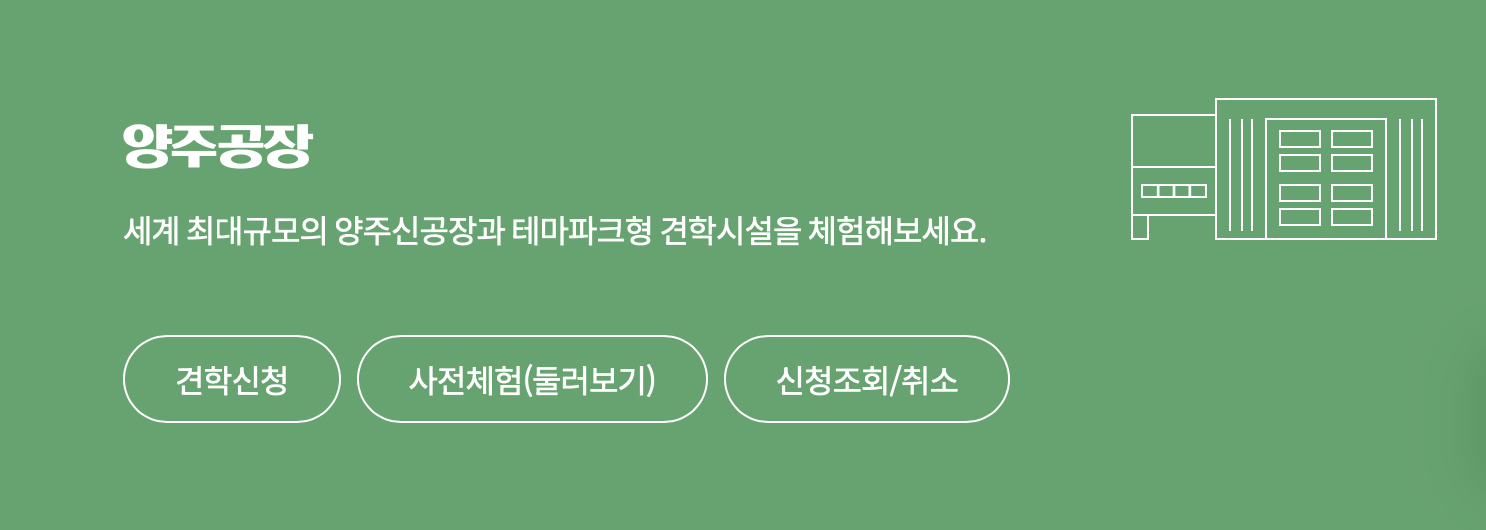 아이들에게는 우리가 마시는 우유가 어떻게 만들어지는지 배우는 살아있는 교육의 장이 되고, 어른들에게는 추억과 선물을 안겨주는 서울우유 양주 공장 견학. 오늘 알려드린 예약 꿀팁을 활용하셔서 다가오는 주말, 가족들과 특별한 나들이를 계획해 보시는 건 어떨까요?