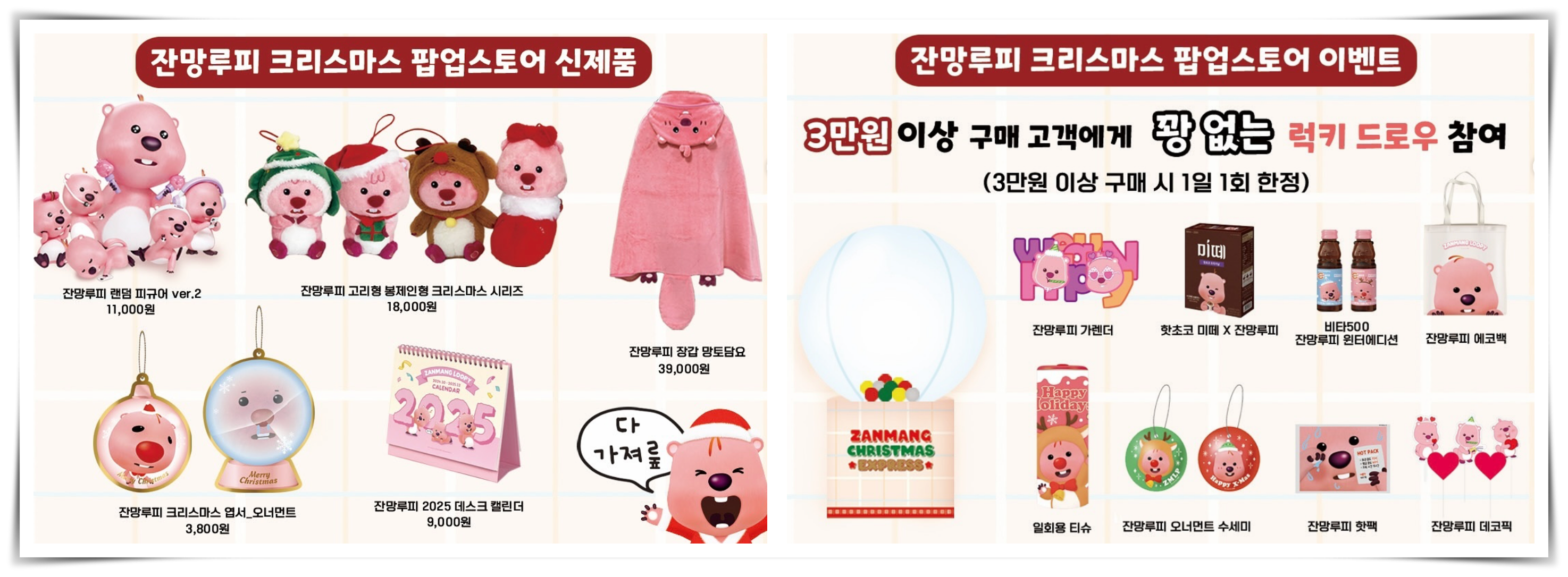 이번 잔망루피 크리스마스 팝업스토어 이벤트로는 3만 원 이상 구매 고객에게 꽝이 없는 러키 드로우 참여 할 수 있는 기회가 주어집니다.