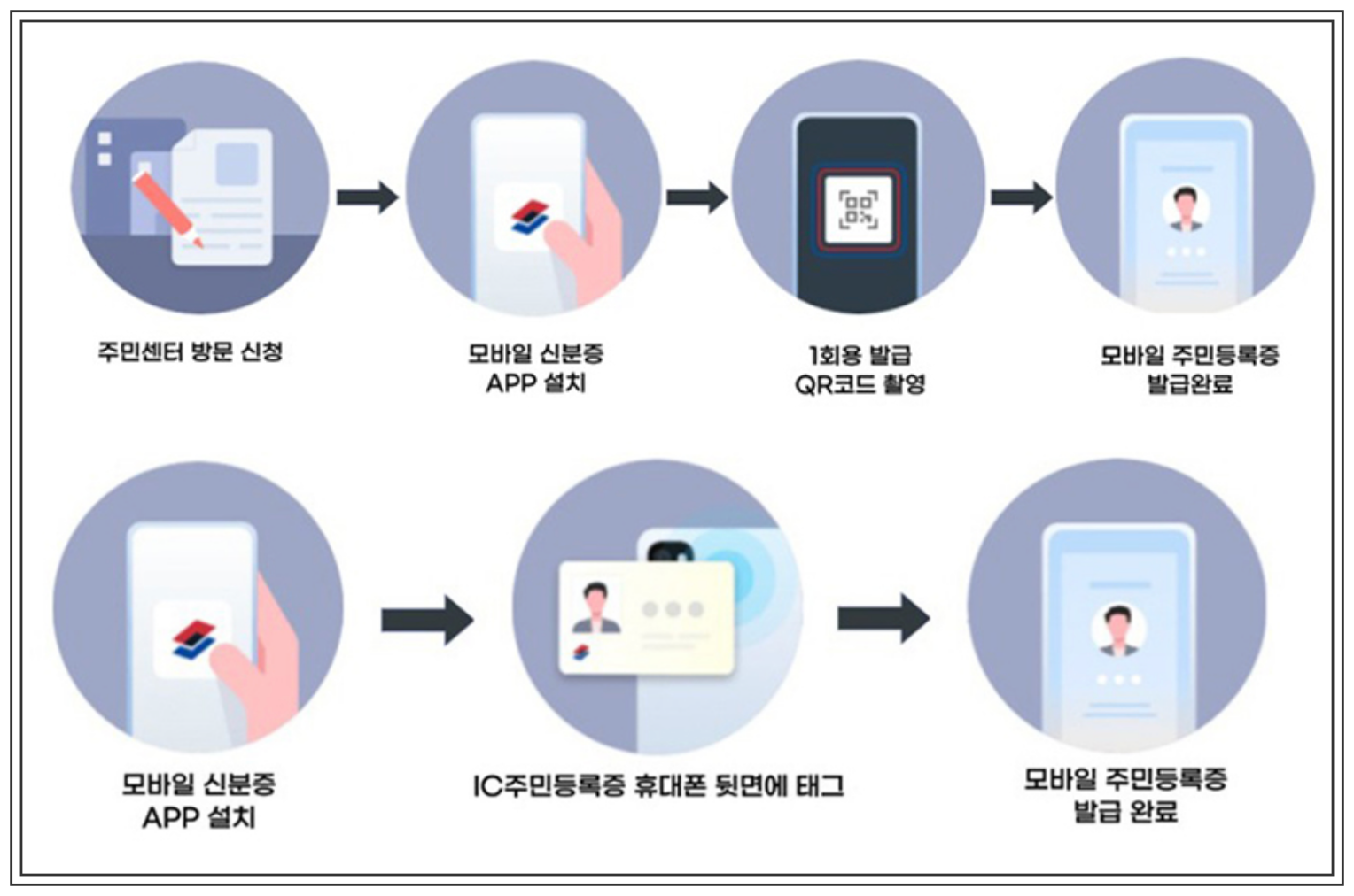 - IC 칩 주민등록증 교체 후 발급 방법 : 실물 주민등록증을 IC칩이 내장된 주민등록증으로 교체를 하면 읍, 면, 동 주민센터를 방문하지 않아도 모바일 주민등록증을 직접 발급 받을 수 있습니다.