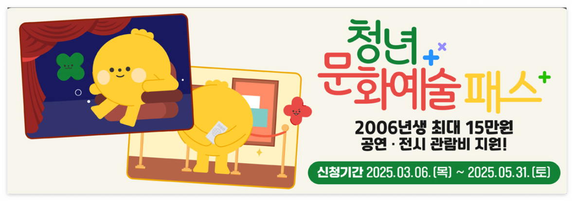 사회초년생들인 19세 청년에게 문화생활 (연극, 뮤지컬, 클래식, 콘서트, 음악 등) 및 전시 관람비를 지원하여 청년의 문화 관람을 위해 지원해주는 사업입니다.