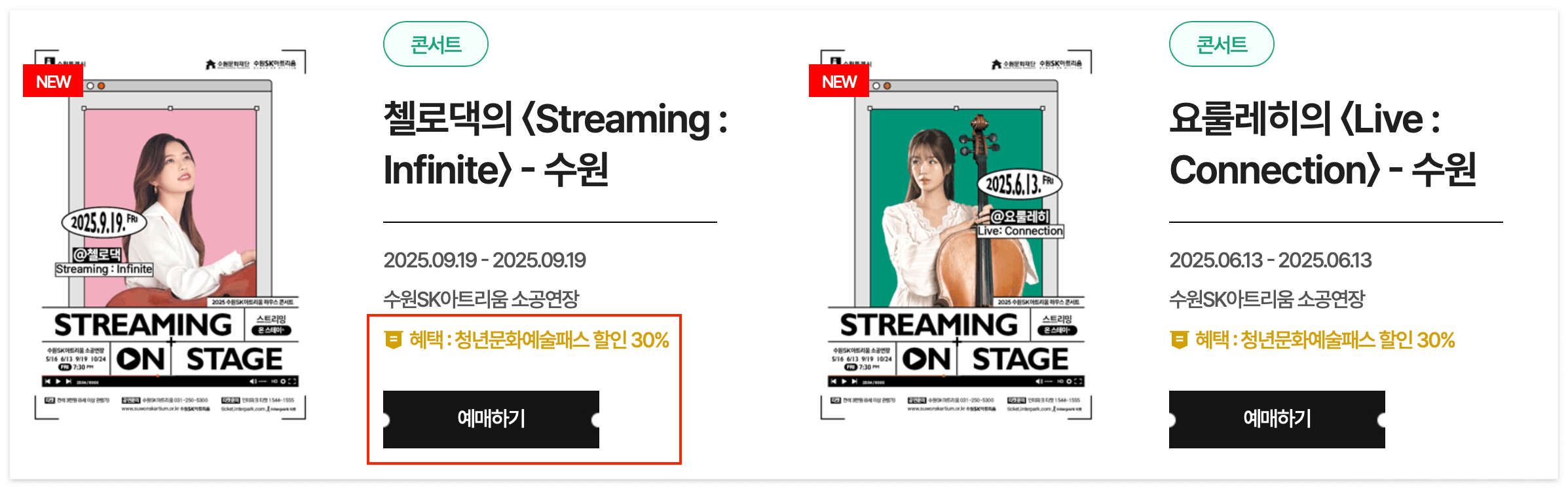 티켓 예매가 어렵다면 청년문화예술패스 누리집 홈페이지에서 공연 및 전시 정보를 확인하고 원하는 공연이 있다면 예매를 하여 관람할 수 있습니다.