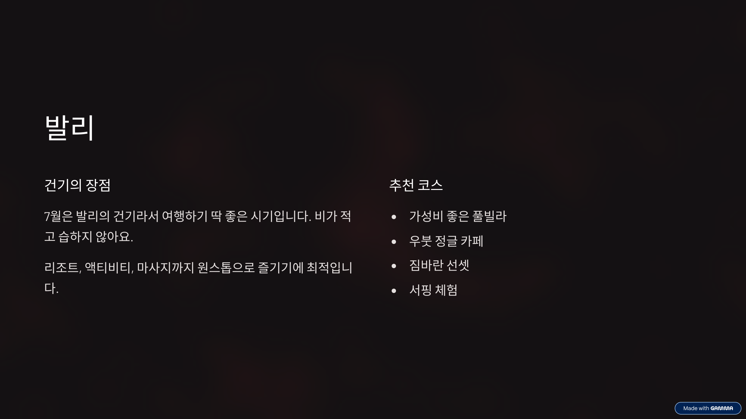 7월에도 날씨가 맑고 안정적이며, 한국인 대상 프로그램도 많아 언어 장벽 걱정이 적어요.