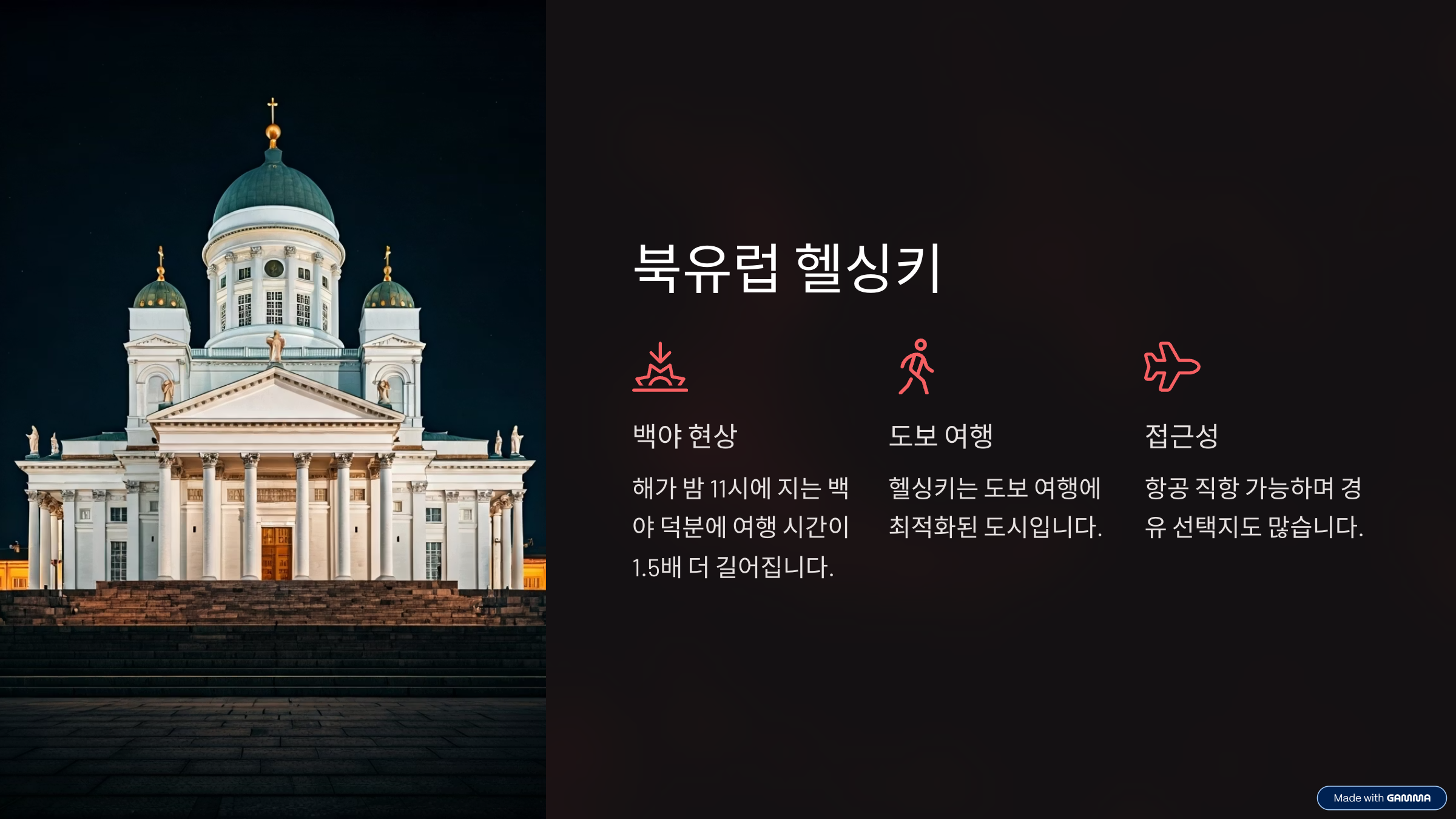 헬싱키는 도보 여행에 최적화된 도시이며, 디자인과 자연이 조화롭게 어우러져 있어 감성 여행자에게도 잘 맞아요.