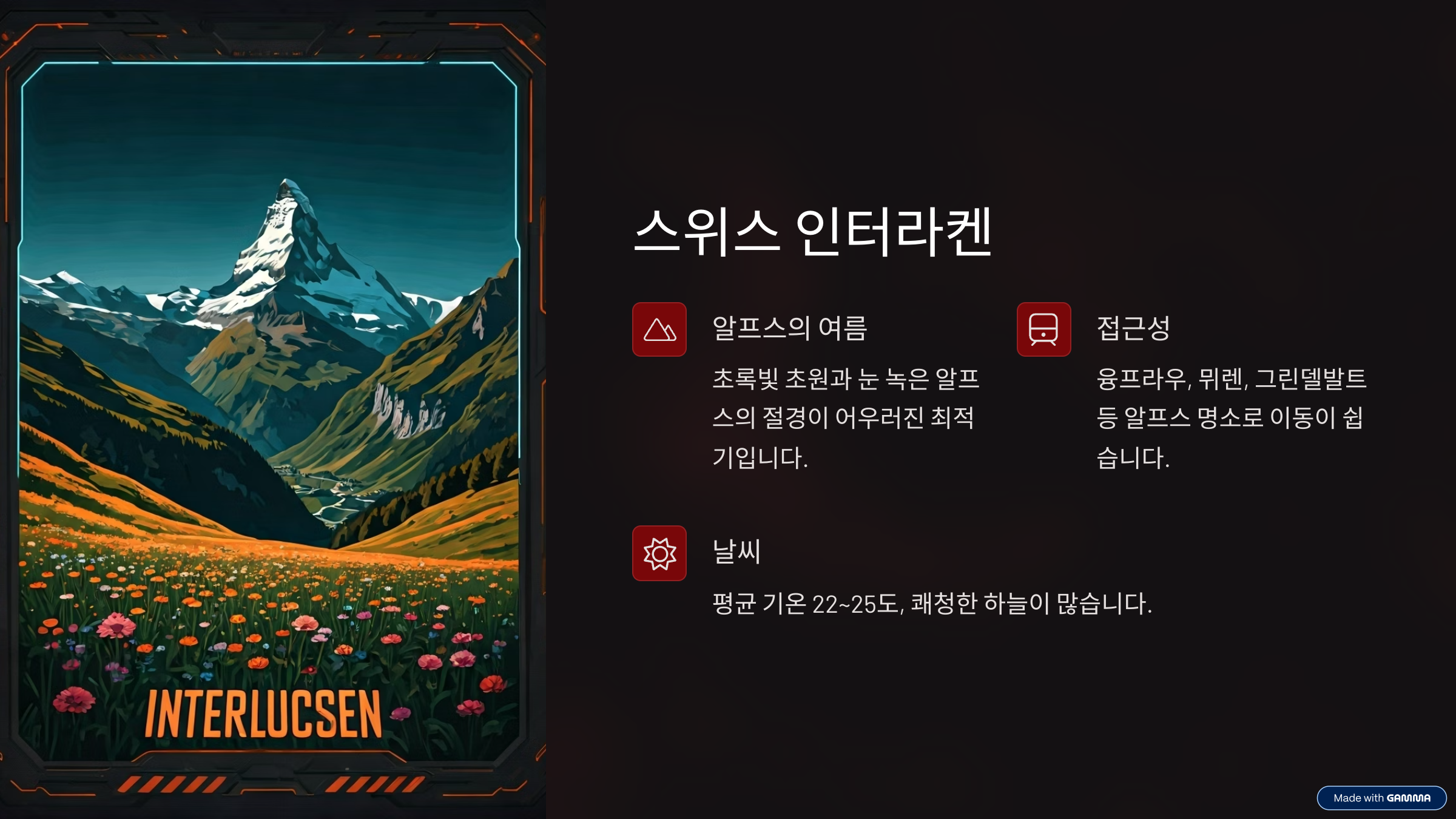 특히 인터라켄은 융프라우, 뮈렌, 그린델발트 등 알프스 명소로 이동이 쉬워 첫 유럽 여행자에게도 좋은 선택이에요.