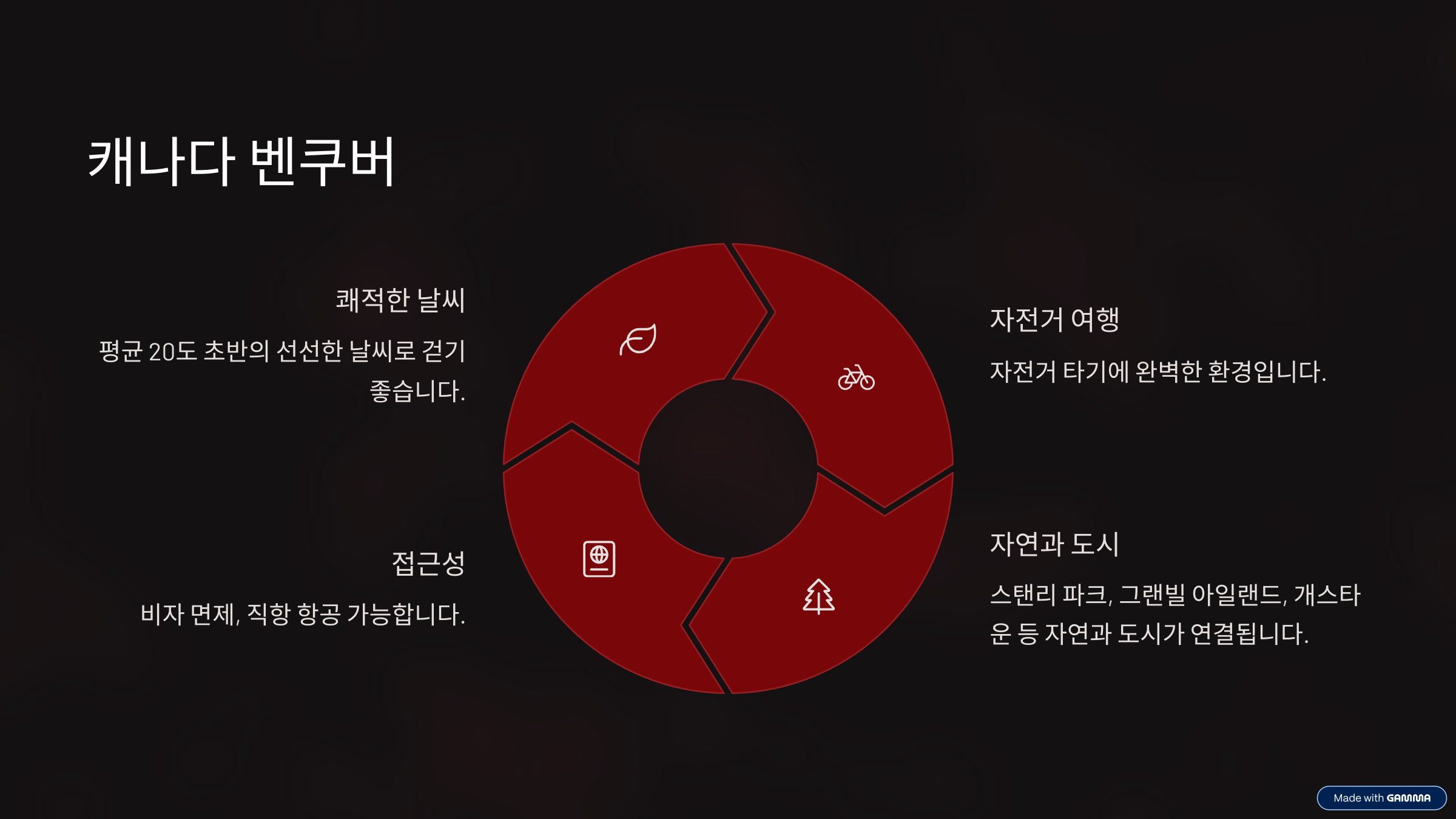 스탠리 파크, 그랜빌 아일랜드, 개스타운 등 자연과 도시가 연결된 코스들이 많아 장기 체류자에게도 만족도가 높아요.