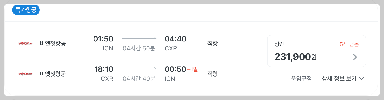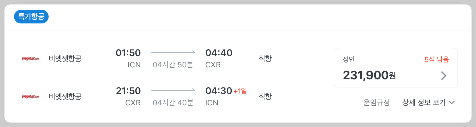 우선 항공권은 출발일에 따라 요금이 다소 유동적이지만, 4~5월 기준으로 왕복 40만 원 내외(인천-나트랑 직항 기준)입니다.