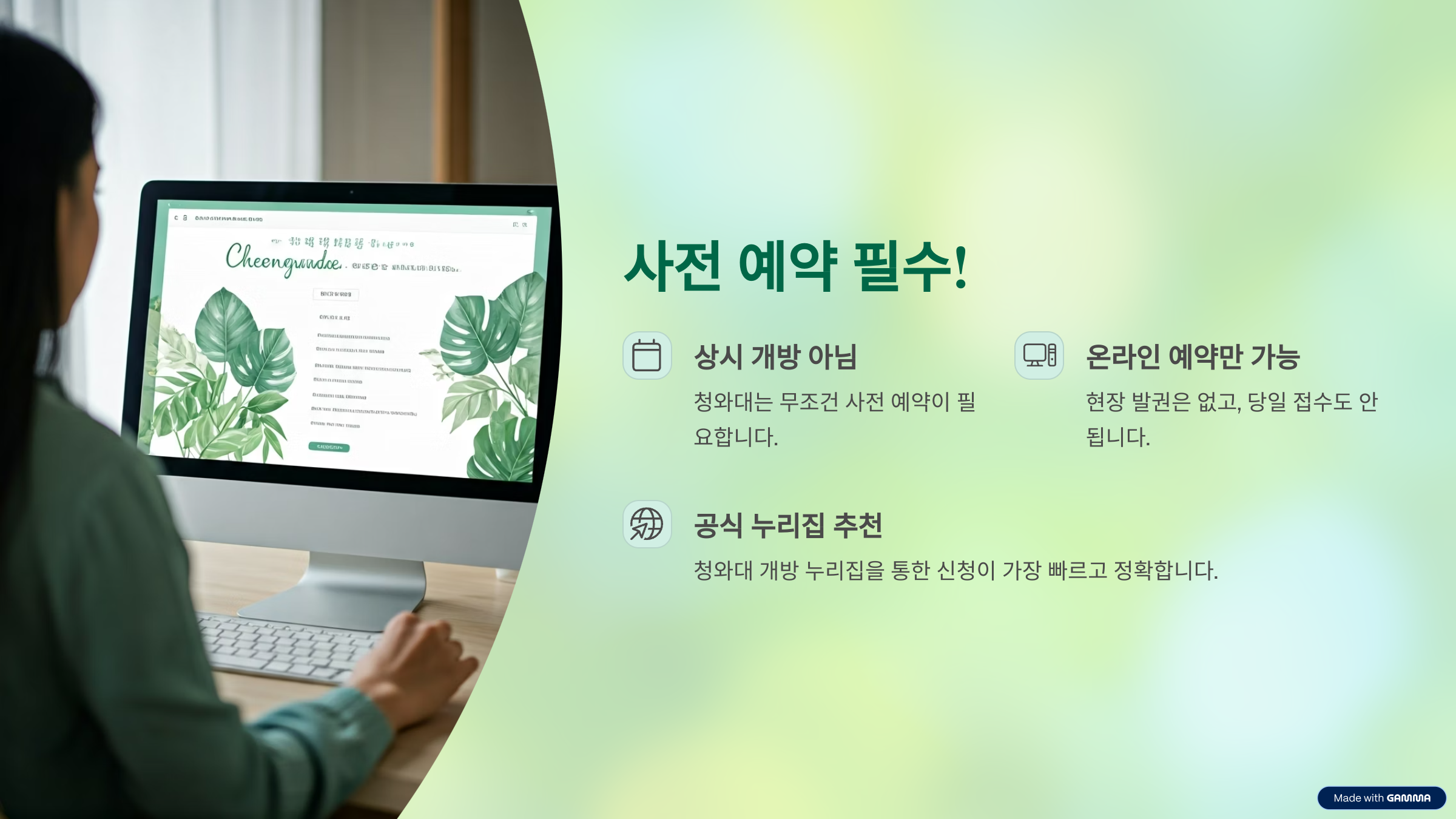 청와대는 상시 개방된 장소가 아니기 때문에, 무조건 사전 예약이 필요합니다.