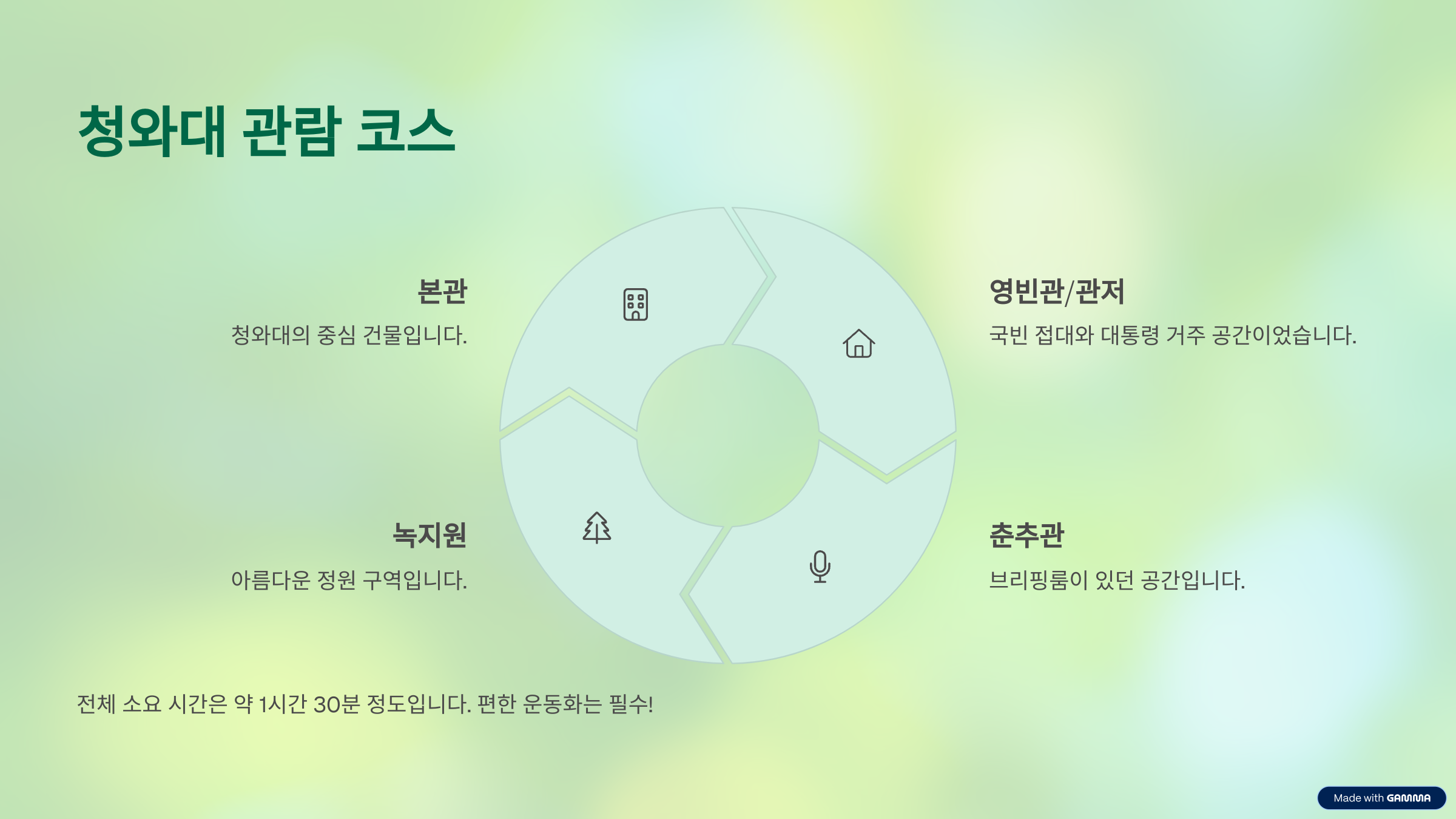 청와대 내부는 본관, 영빈관, 관저, 춘추관, 녹지원 등으로 구성되어 있고, 정해진 동선을 따라 가이드 없이 자유 관람하는 방식이에요.