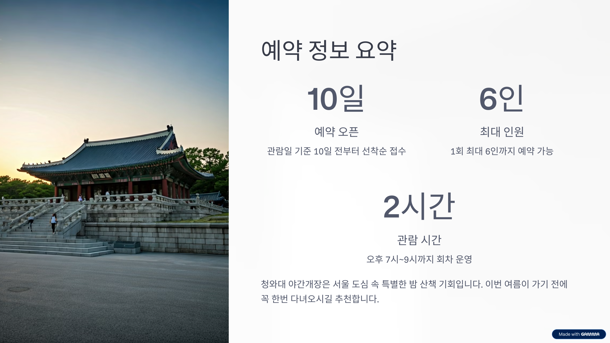청와대 야간개장 예약은 단순한 관람이 아니라, 서울 도심 속에서 특별한 밤 산책을 즐길 수 있는 기회예요.