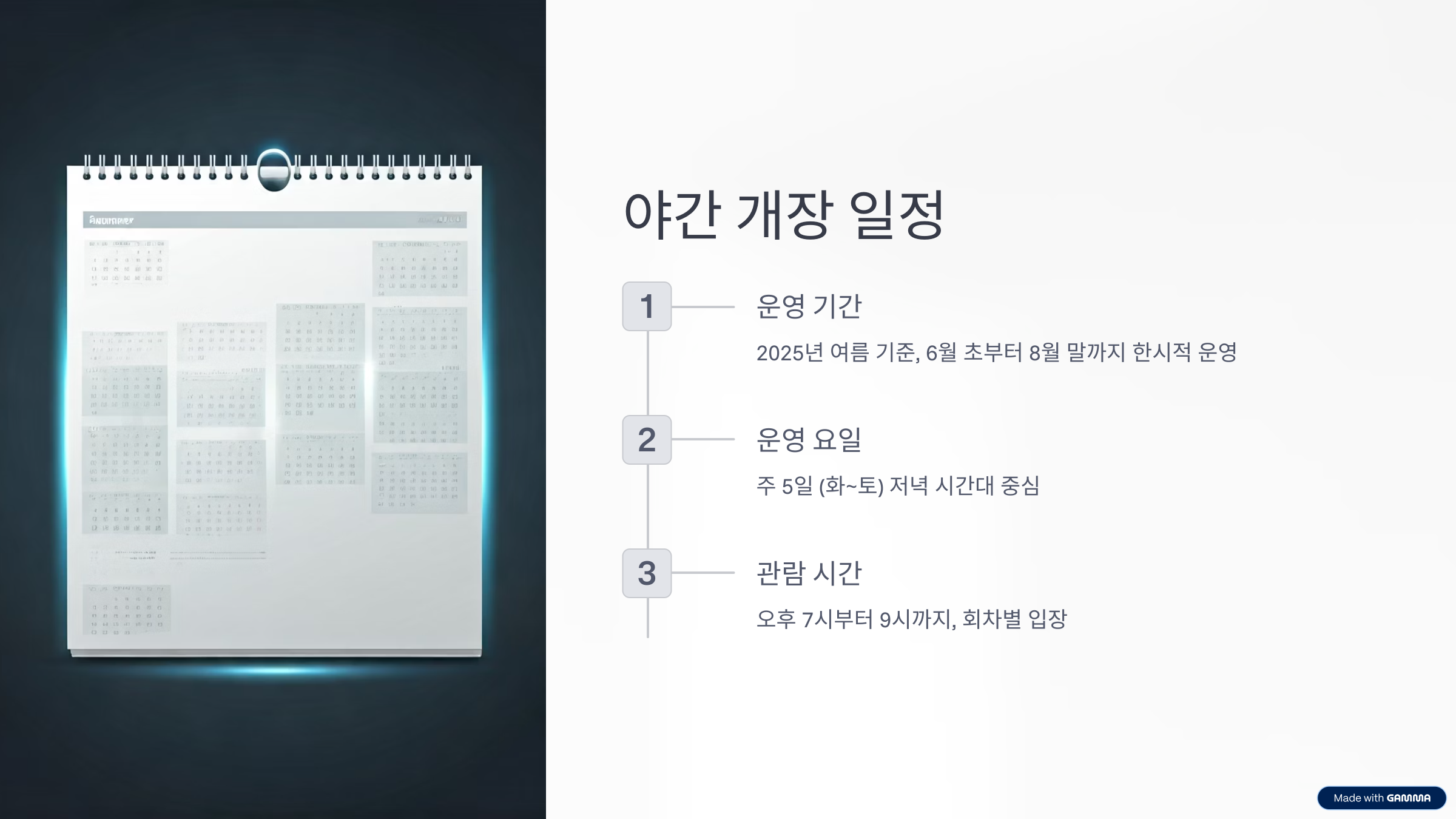 관람은 오후 7시부터 9시까지, 회차별 입장으로 진행되고, 일몰 이후의 풍경을 즐기기에 최적의 시간이에요.