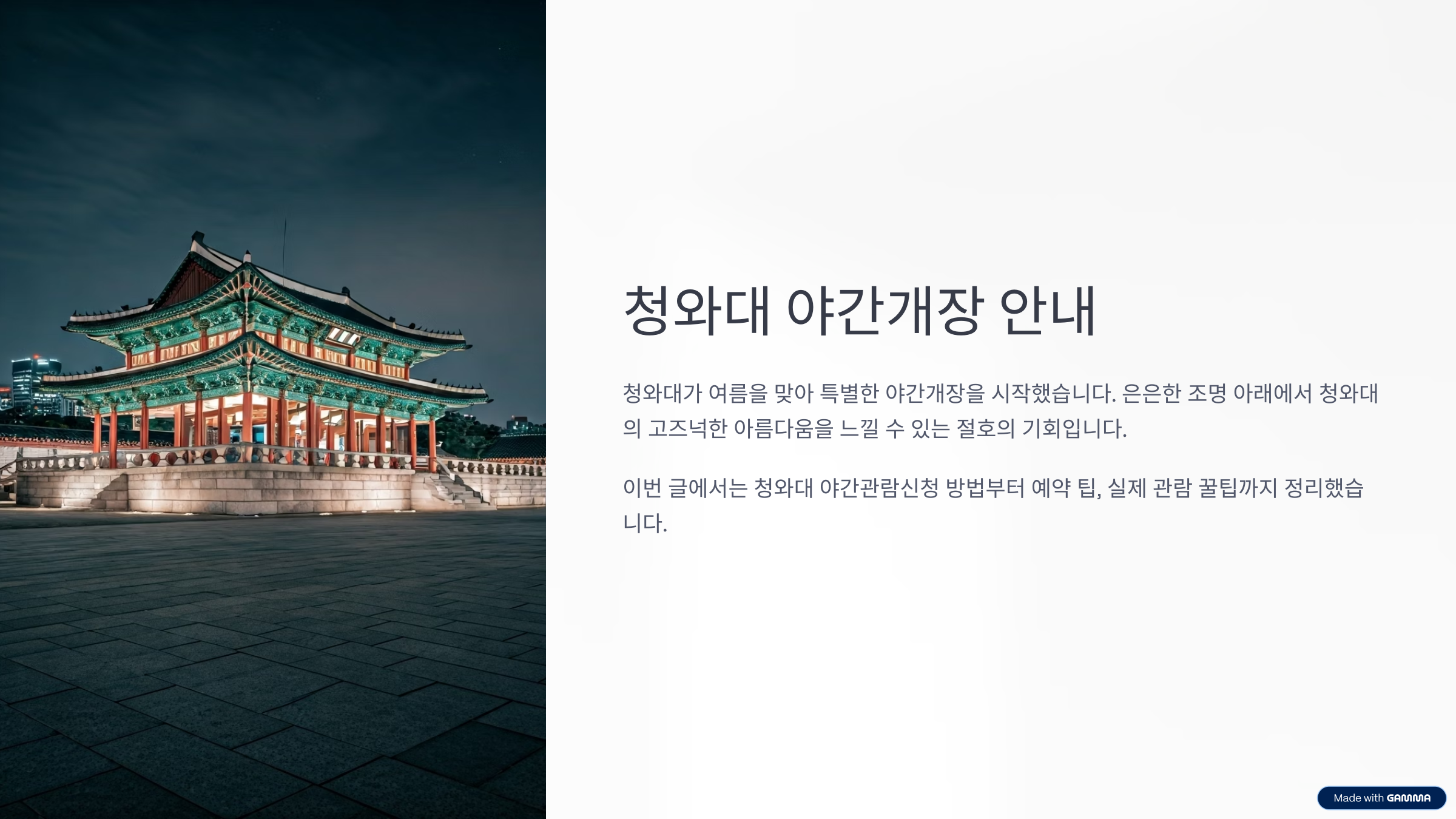 한낮의 뜨거운 햇빛을 피하고, 은은한 조명 아래에서 청와대의 고즈넉한 아름다움을 느낄 수 있는 절호의 기회죠.